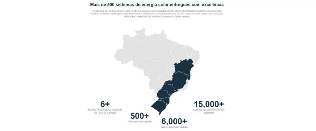 A TECSUL ENERGIAS, por exemplo, atua exclusivamente com energia solar desde 2013 e já entregou mais de 500 sistemas fotovoltaicos em 6 estados brasileiros. Isso demonstra estabilidade, expertise e credibilidade.