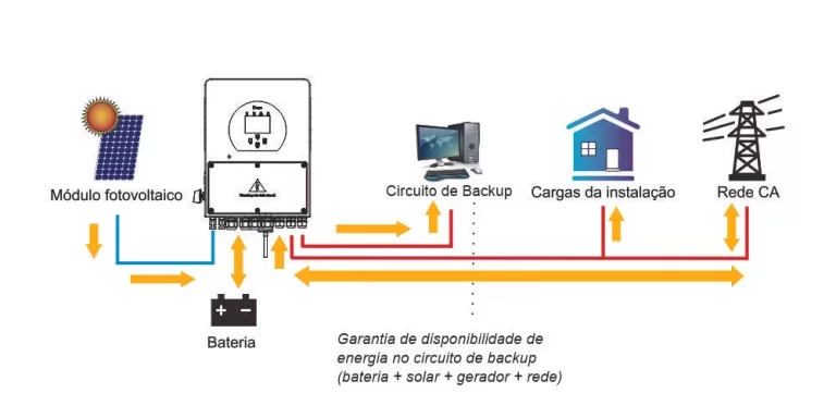 - O sistema híbrido combina os dois modelos, permitindo o uso da rede e das baterias para maior segurança energética.